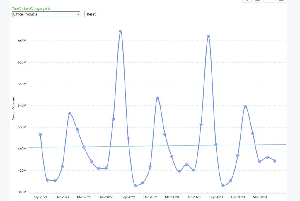 This chart is for the Office Products category. Its biggest peak is in August, which makes sense because it coincides with the start of the new school/college year.